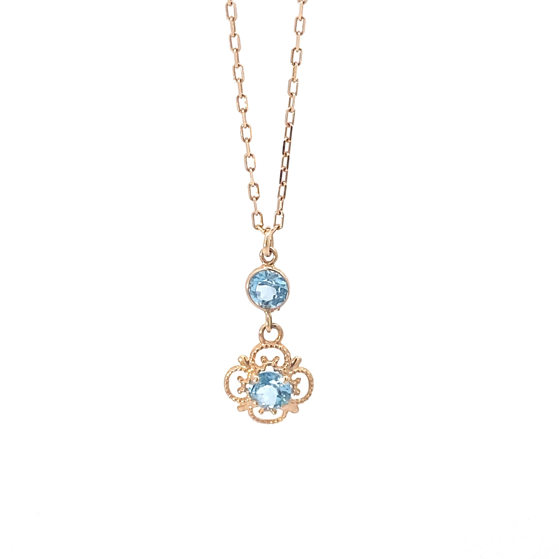 This 14K yellow gold pendant features a stunning Swiss blue topaz, a rare gem with a 0.6 carat weight. The delicate flower design is complemented by a 17 inch chain, adding sophistication to any outfit. Elevate your style with this gorgeous and unique pendant.