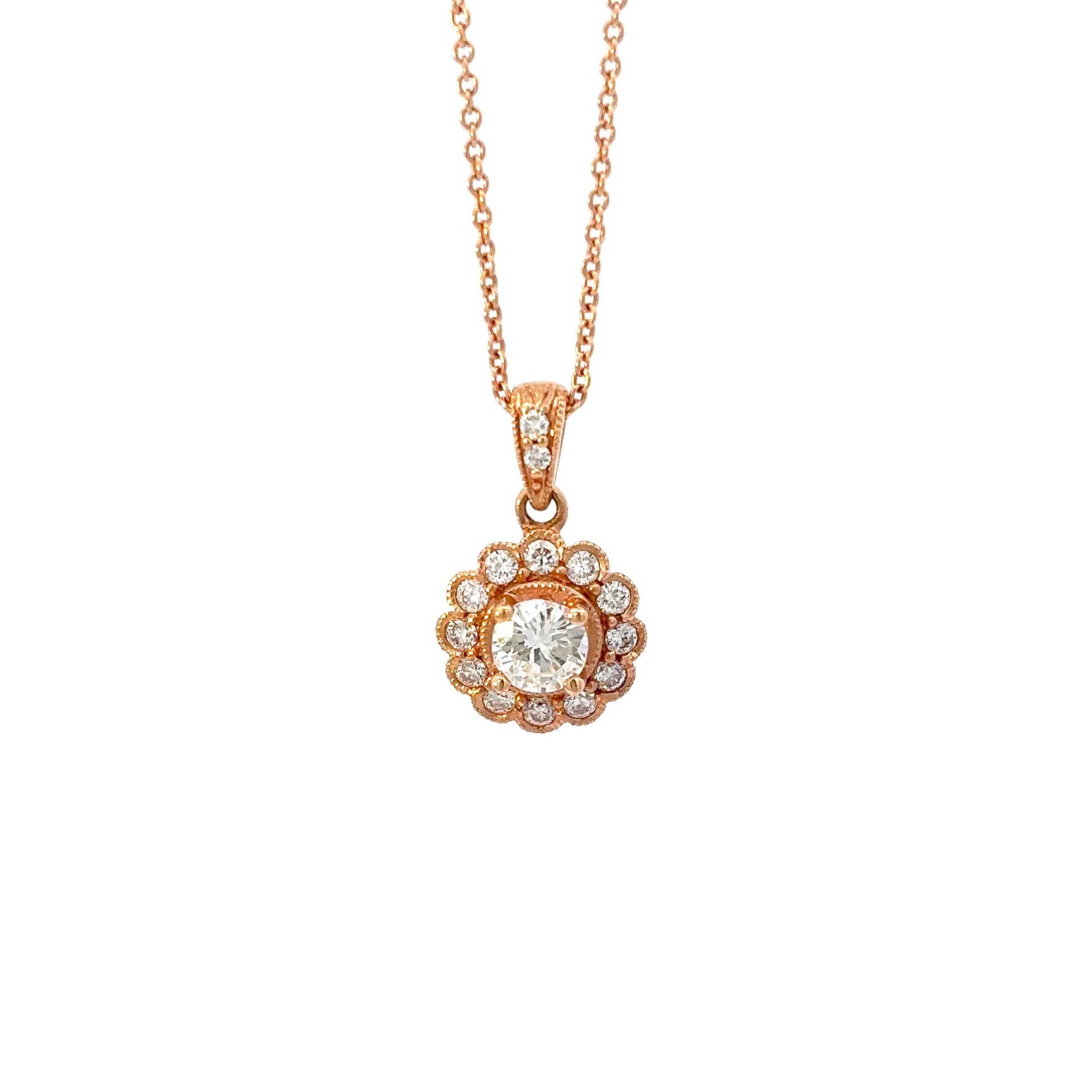 Crafted from luxurious 18K rose gold, this flower pendant is adorned with 14 sparkling diamonds totaling .25 carats. The perfect accessory for any occasion, this pendant adds elegance and sophistication to any outfit. Indulge in its timeless beauty and make a statement with this stunning piece.